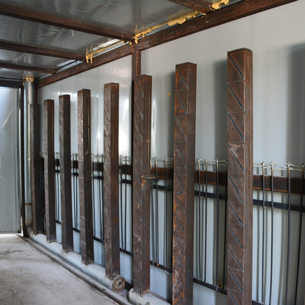 石英石板胚放在平鋪層疊的烘烤架上,利用軌道滑進烘烤。石英石板胚固化上色以后也是通過烘烤架整體轉移。